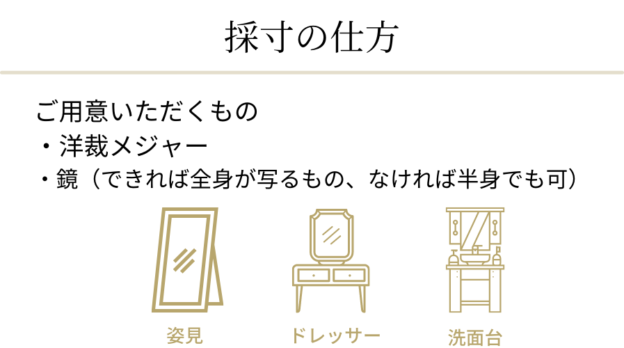 ※ビスチェはブラサイズとウエスト寸法も必要な場合があります。また、ウエストニッパーはウエスト寸法、ガードルやペチコートはウエストとヒップ寸法が必要になります。